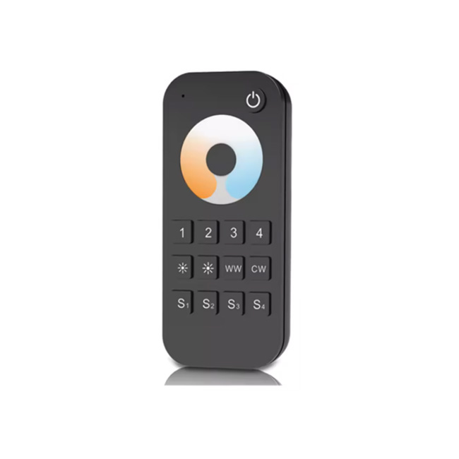 Hand held remote for dual colour LED. Has built in dimming and can control four different zones.