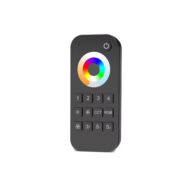 RGBW LED handheld remote, with Colour wheel, pre-programmed colour changing scenes, built in dimming and four zone control.