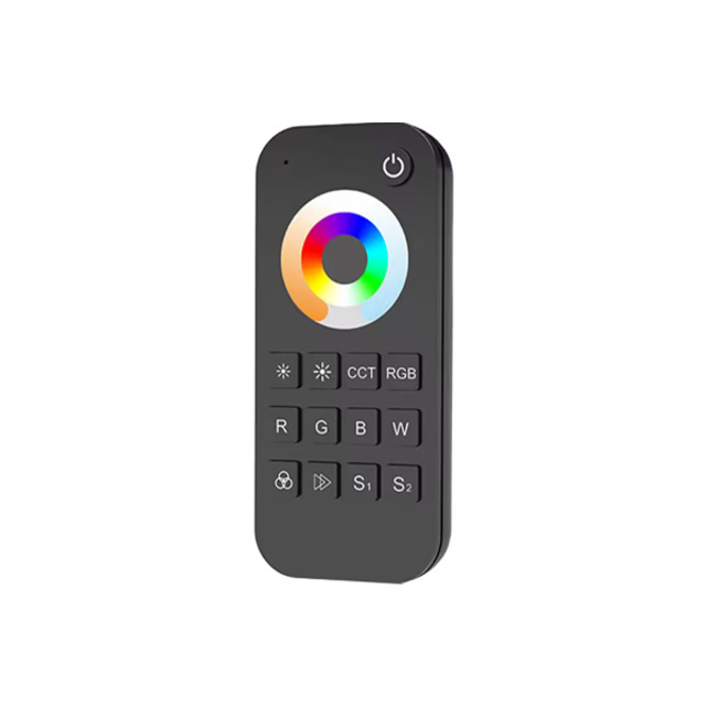 RGBW LED handheld remote, with Colour wheel, pre-programmed colour changing scenes, built in dimming and single zone control.