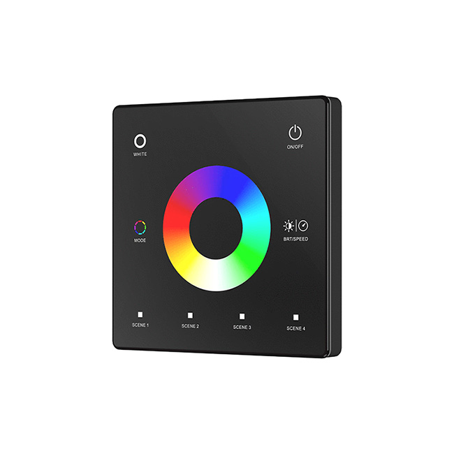 Black wall mounted RGBW LED remote, with Colour wheel, pre-programmed colour changing scenes, built in dimming and single zone control.